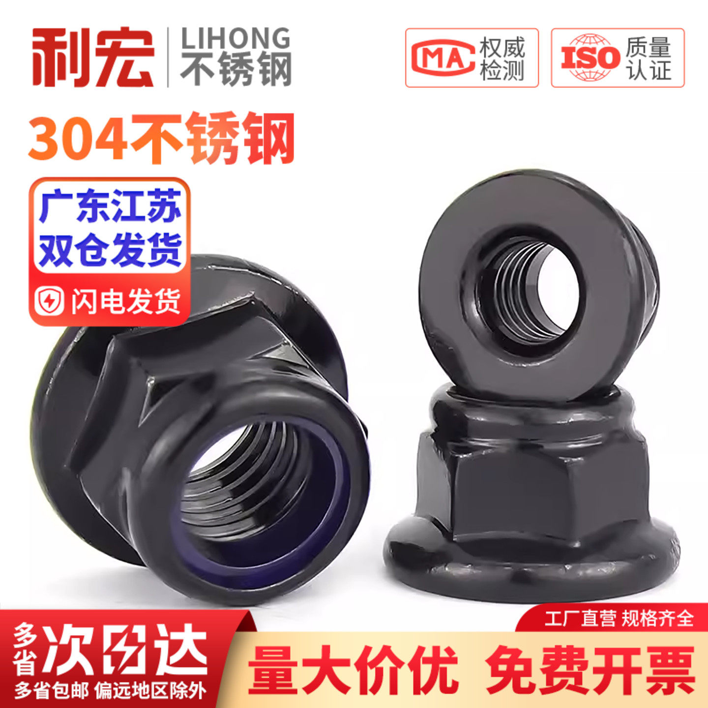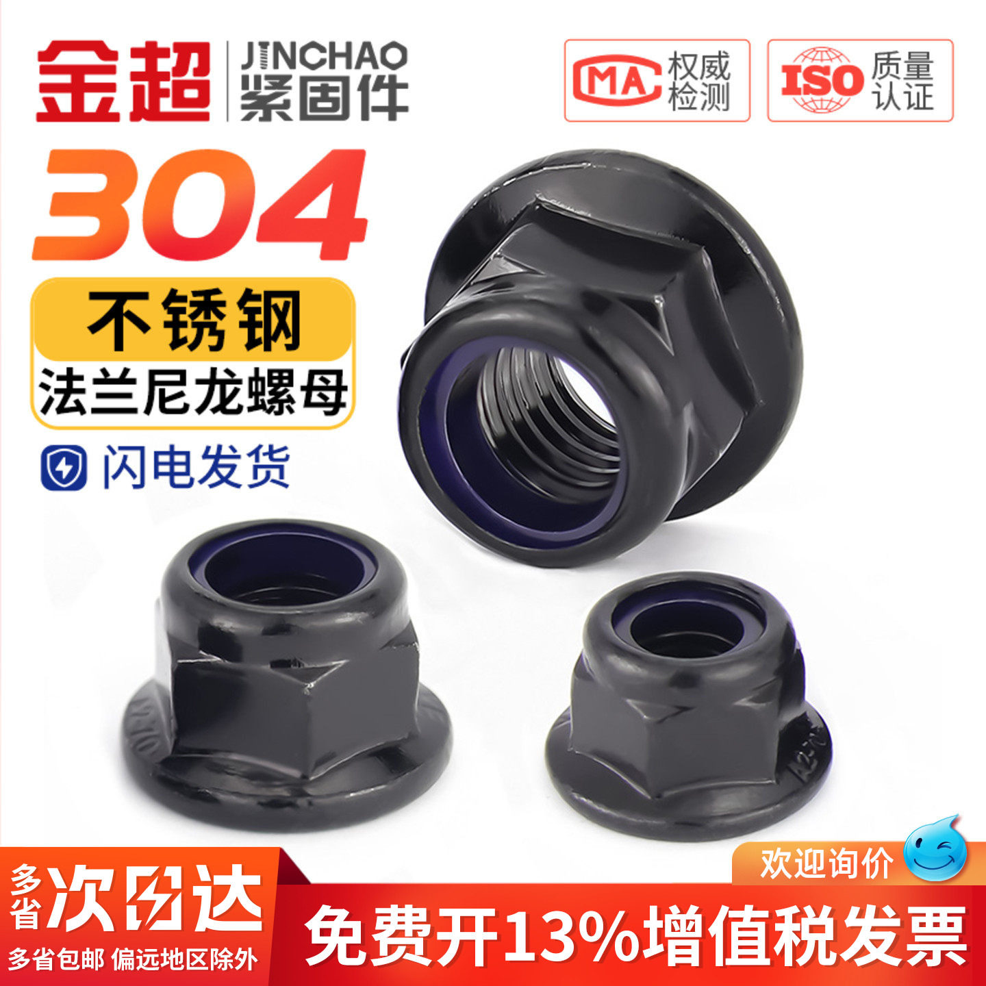 黑色304不锈钢尼龙防松锁紧螺母法兰自锁螺丝帽黑锌带垫尼帽螺帽