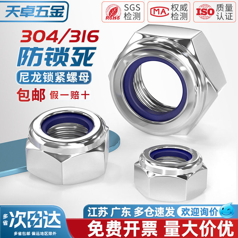 天卓五金304/201/316不锈钢锁紧螺母 六角防松防滑尼龙自锁螺丝帽