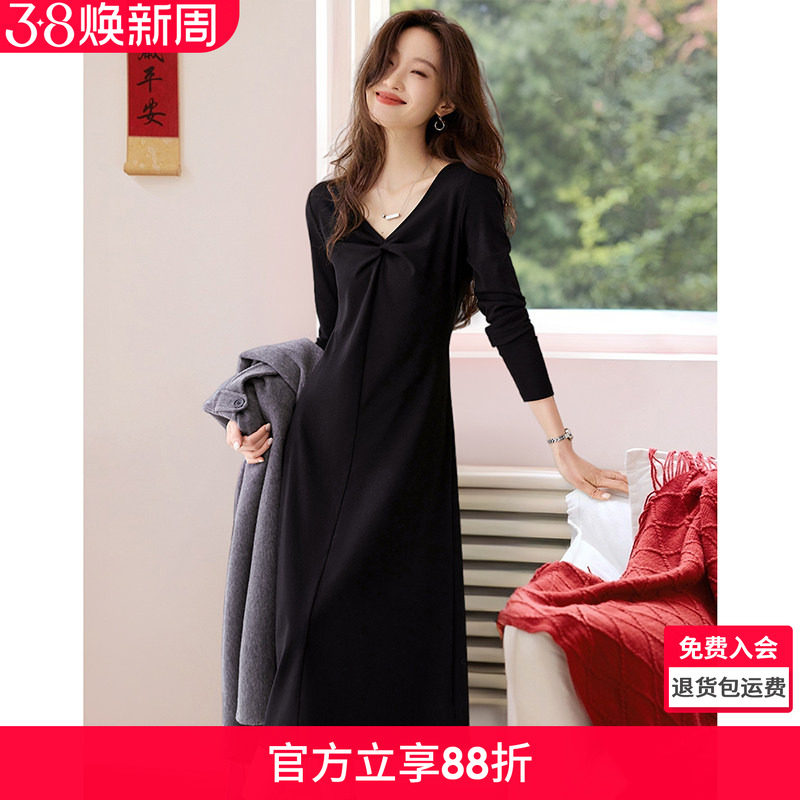 阔色黑色v领内搭打底针织连衣裙女25秋冬季新款长袖毛衣小黑裙子