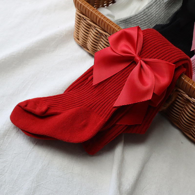 【点点】红色儿童手工大蝴蝶结连裤袜纯色宝宝小女孩打底裤袜春秋