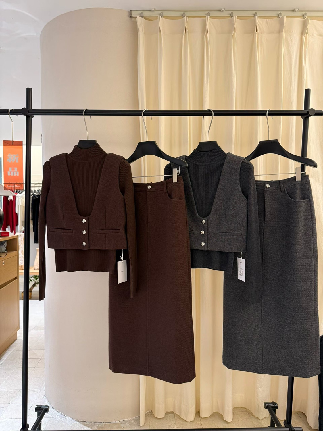 【现货】25秋冬小香风套装女复古针织打底羊毛马甲长包裙三件套裙