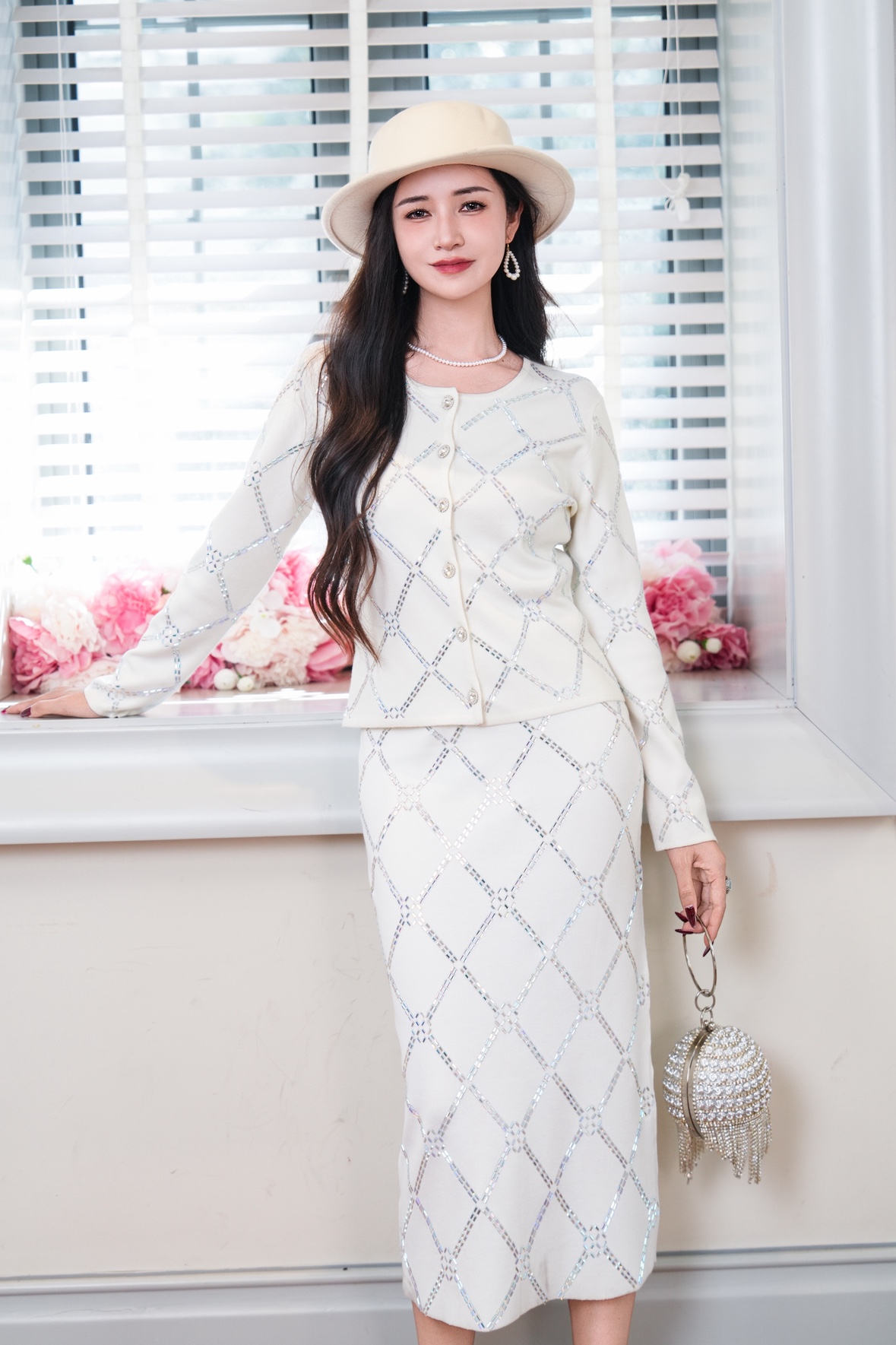 亮闪闪菱形格烫钻针织羊毛时尚套装2025秋冬款包裙中长款裙子开衫