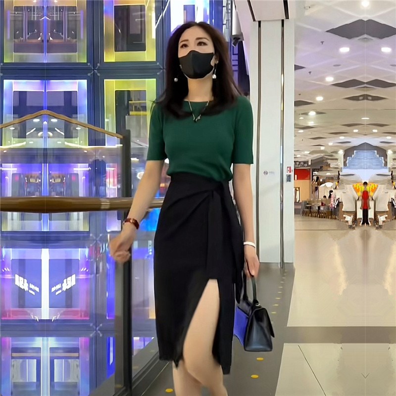 2025夏季一整套搭配套装七分袖针织上衣黑色包裙半身裙两件套装