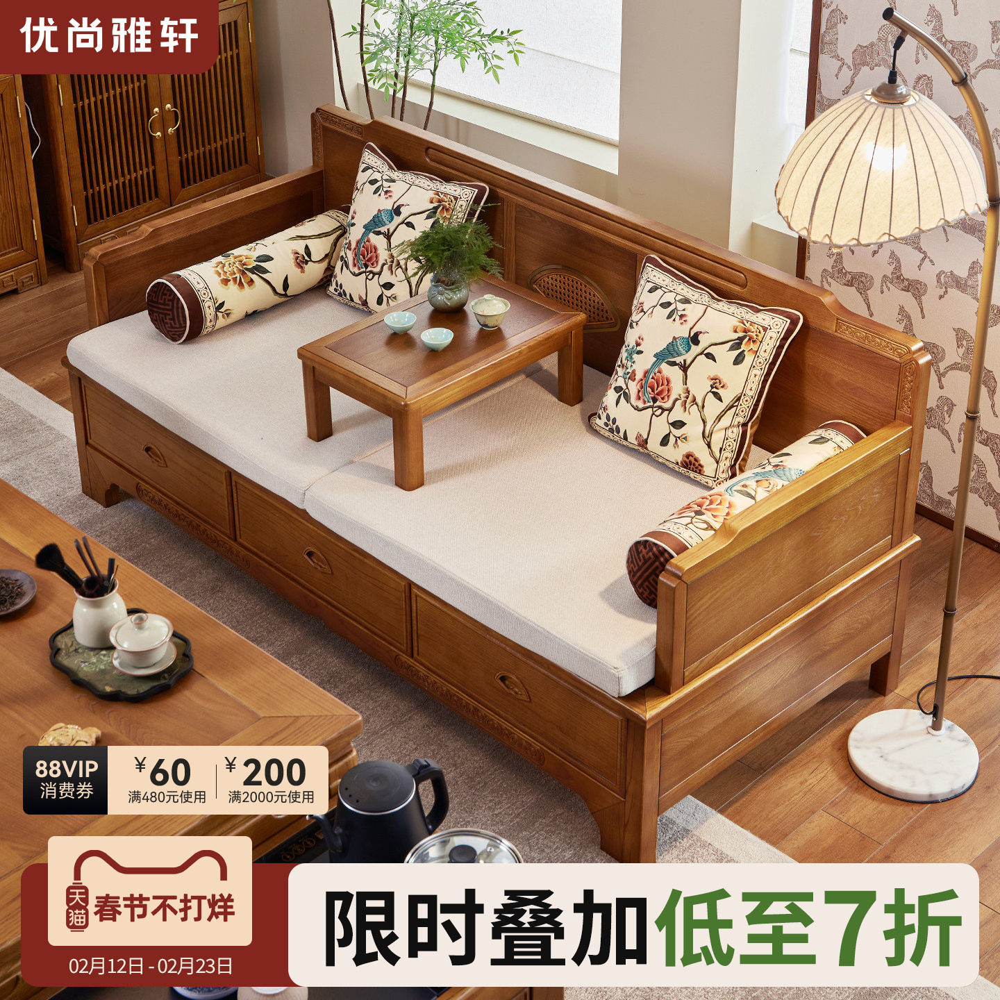 老榆木罗汉床新中式伸缩两用实木沙发床小户型客厅推拉抽拉罗汉榻