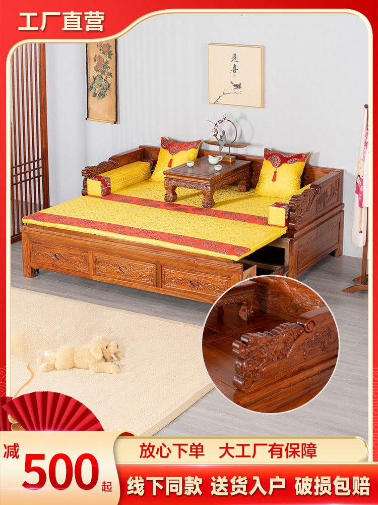花梨色实木罗汉床老榆木推拉床两用沙发床小户型抽拉伸缩罗汉榻床