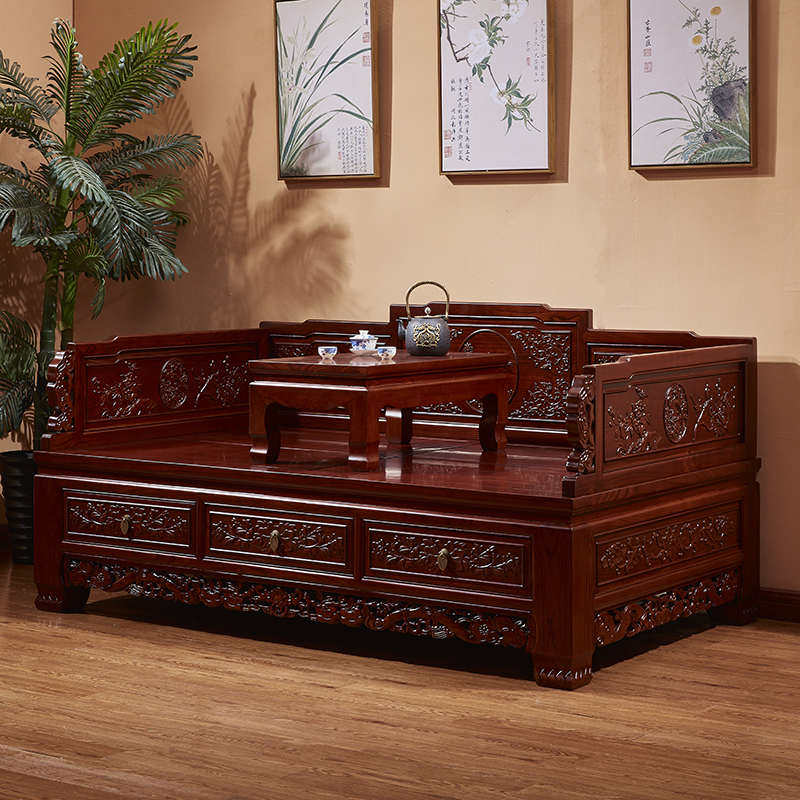 老榆木罗汉床中式推拉罗汉床小户型沙发懒人榻贵妃榻家用单人雕花