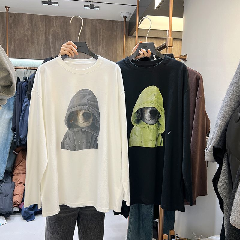 中长款线条小狗刺绣~宽松大版韩系上衣洋气百搭秋季女长袖T恤衫潮