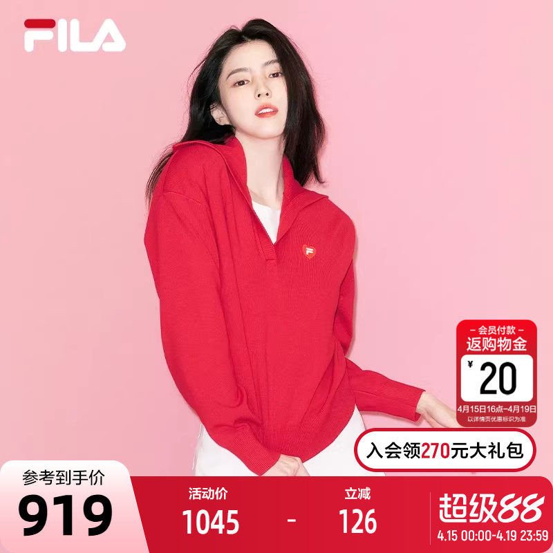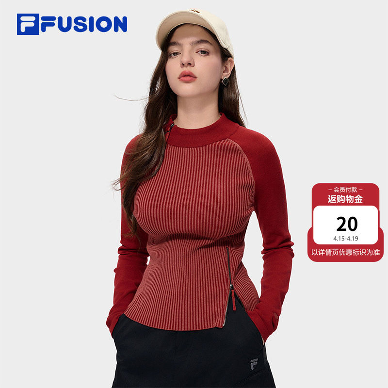 FILA FUSION斐乐潮牌女子编织衫2026春新款红色修身拼接套头毛衣