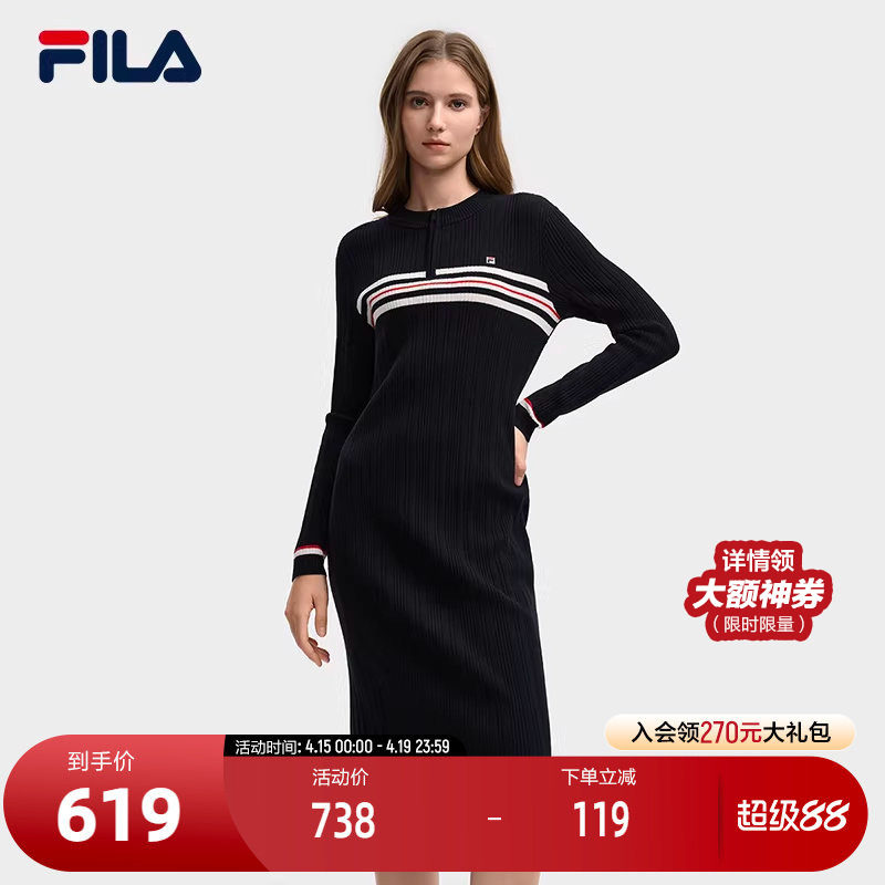 FILA 斐乐官方女子编织连衣裙2025冬新款修身半拉链连身毛衣长裙