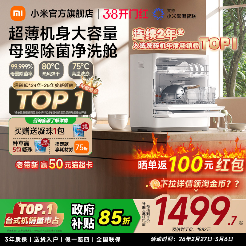 小米官旗米家台式洗碗机家用智能全自动5套S1白色消毒一体免厨改