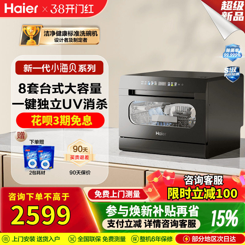 海尔小海贝白台式洗碗机8套免安装小型家用独立UV消毒除菌旗舰