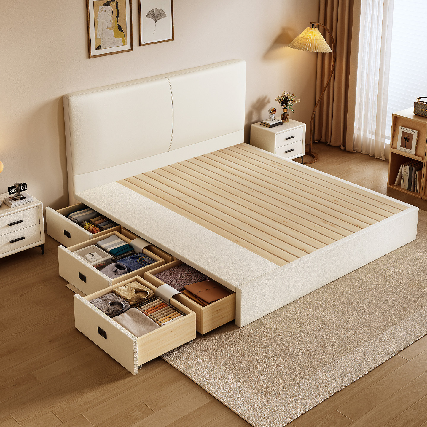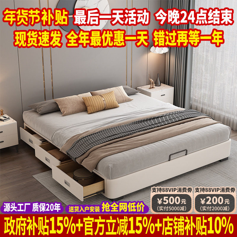 北欧现代简约轻奢1.8米储物婚床实木主卧双人床软包榻榻米真皮床