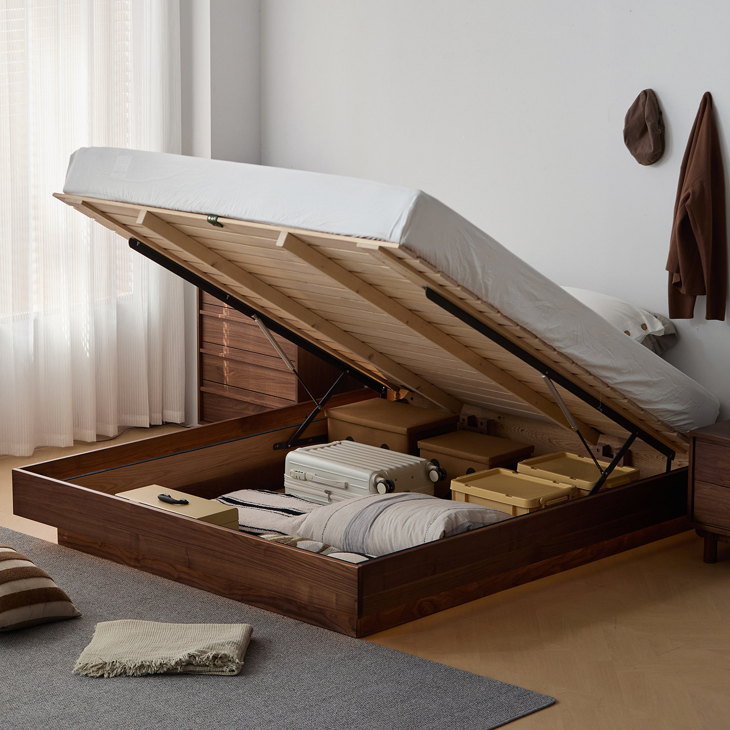 北美黑胡桃木真皮主卧双人床实木箱体无床头储物床小户型榻榻米床
