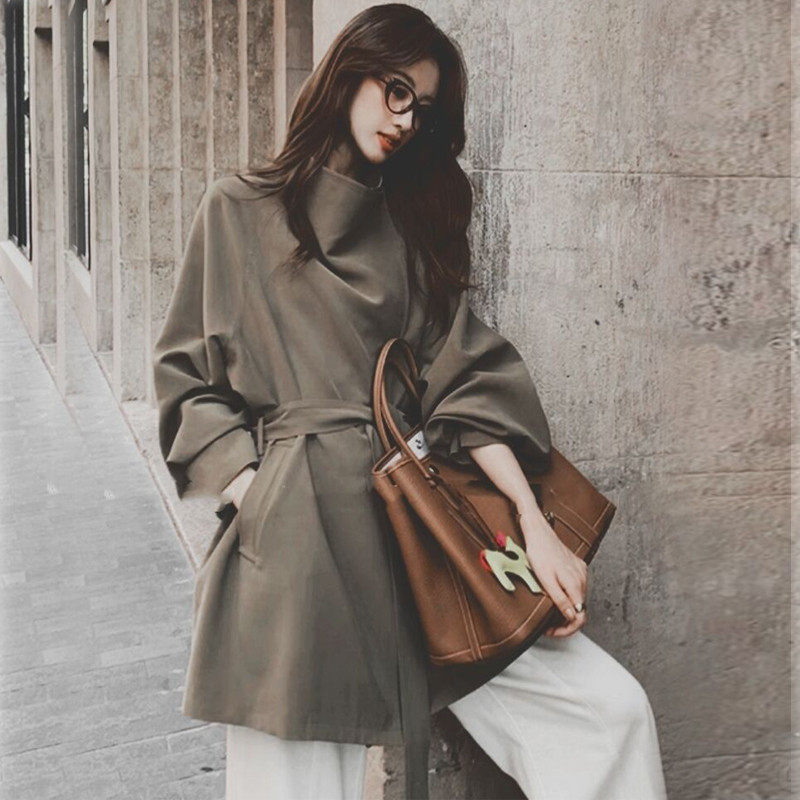 2026新款韩系卡其风衣女短款外套慵懒风翻领系带显瘦休闲通勤上衣