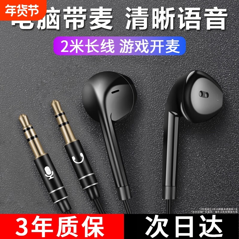 台式电脑耳机有线入耳3米延长耳麦双插头带麦克风直播K歌监听游戏