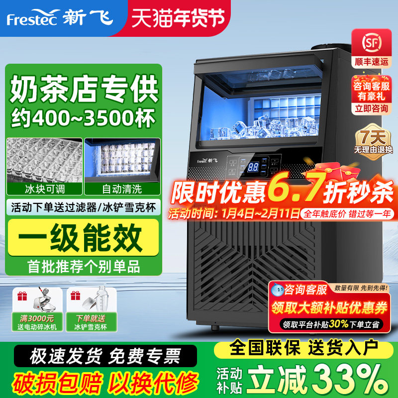 新飞制冰机商用大型奶茶店全自动实心冰块商业小型桶装水一体机器