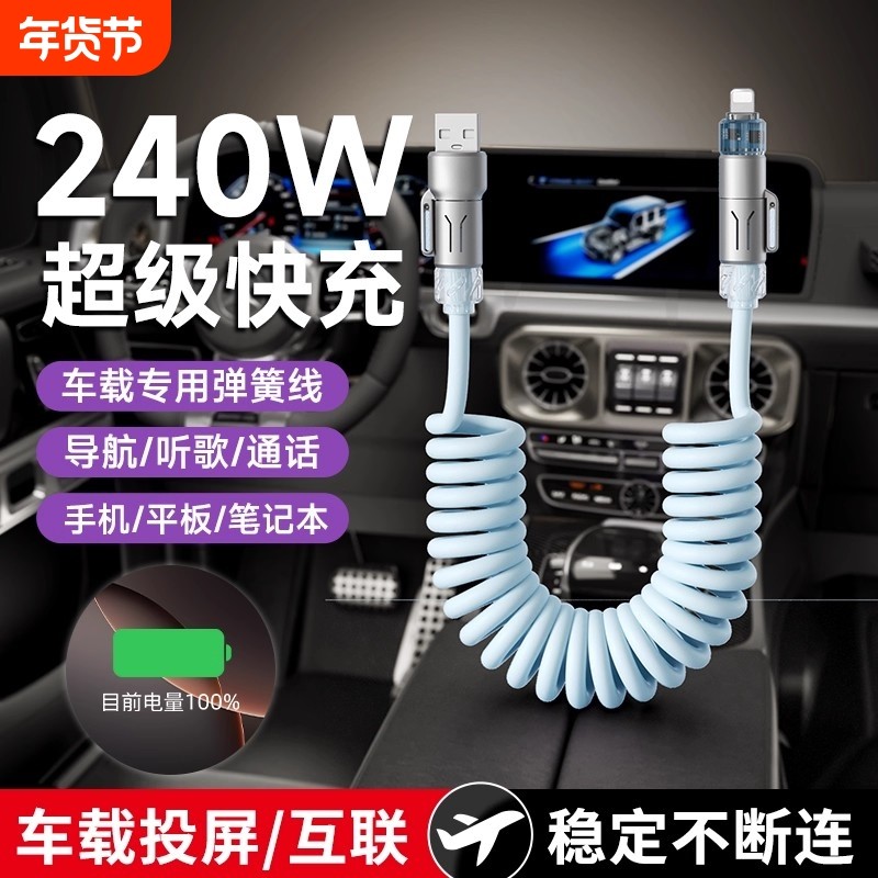 车载充电线弹簧carplay数据线适用苹果iphone华为小米手机充电线双typec快充车载投屏数据线二合一可伸缩快充