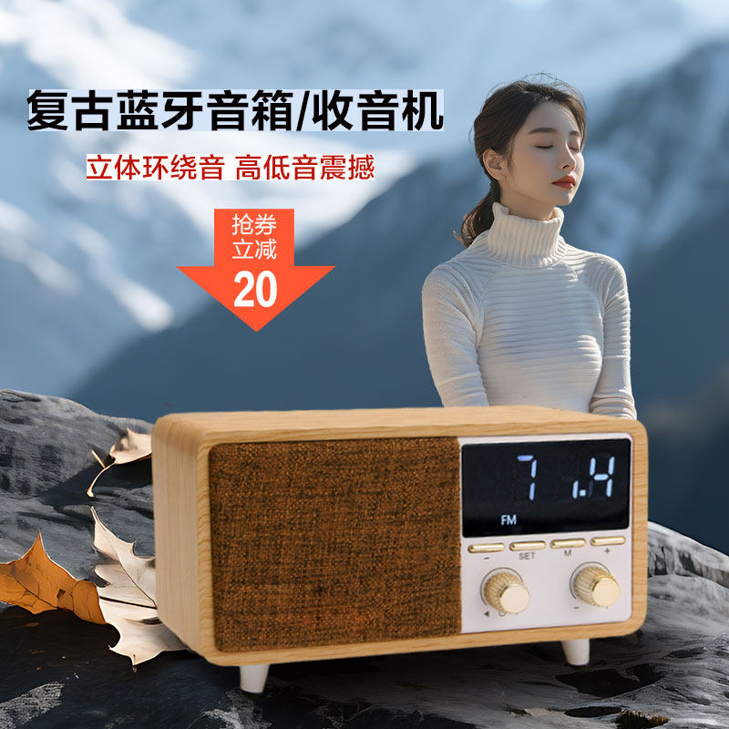 外网300+ 高颜值复古FM钟控收音机蓝牙音箱闹钟可插TF卡U盘AUX IN