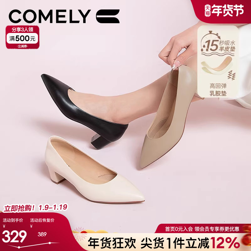 戈美其2025商场同款真皮尖头浅口单鞋女粗跟妈妈鞋软底舒适小皮鞋