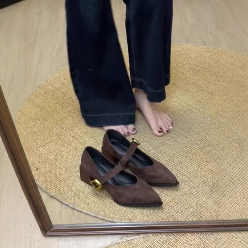 真皮复古尖头粗跟一字带扣玛丽珍鞋秋冬款法式气质通勤浅口单鞋女
