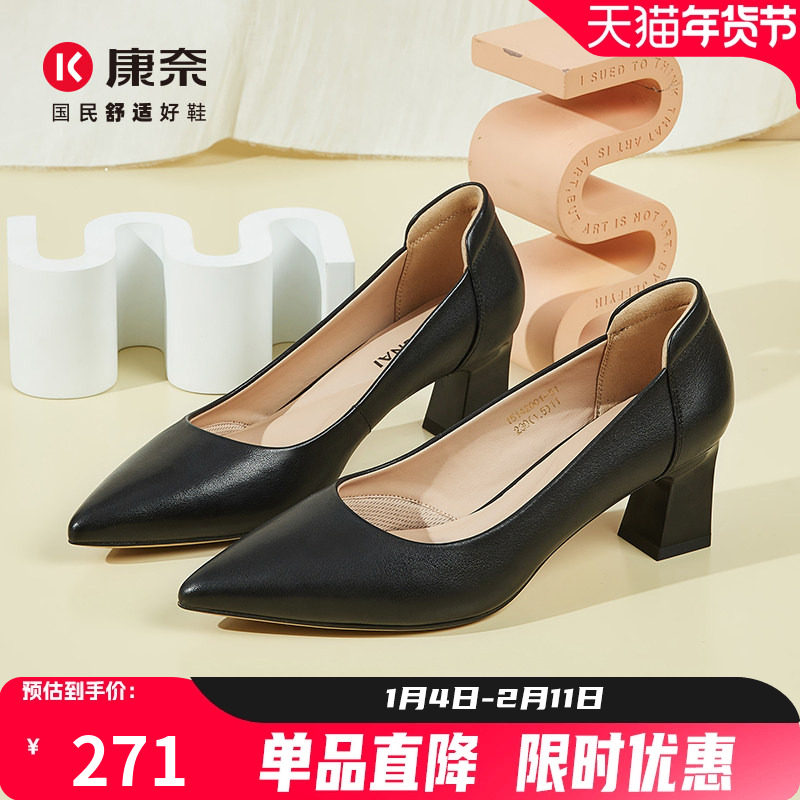 康奈25秋季新款真皮尖头浅口单鞋女粗跟中跟职业通勤鞋公务员女鞋