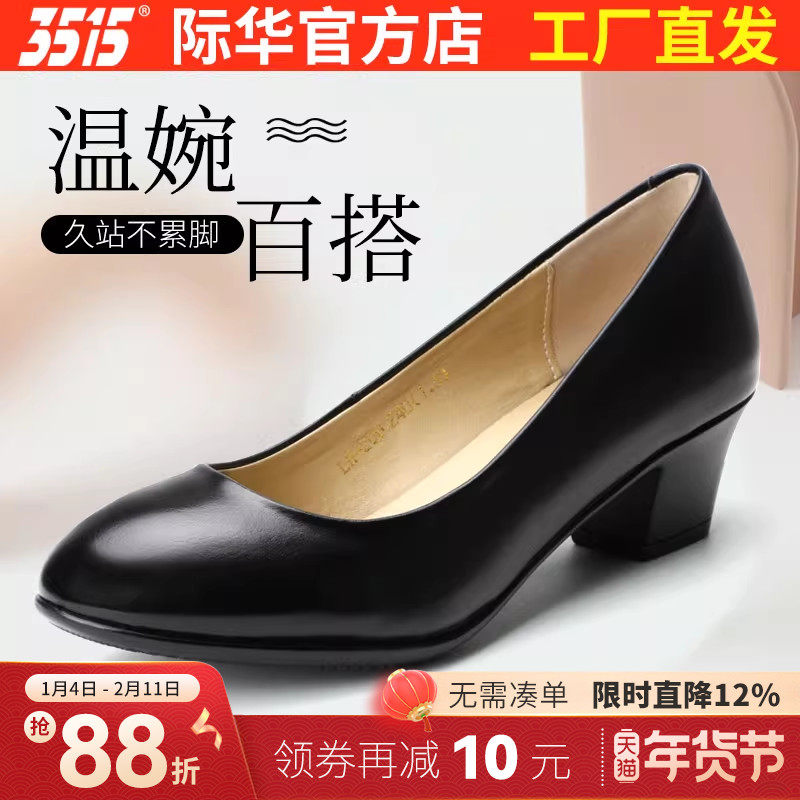 3515际华女鞋真皮浅口尖头粗跟OL工装鞋单鞋透气黑色职业女士皮鞋