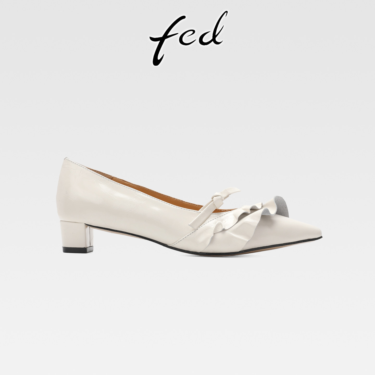 fed小众设计感真皮粗跟荷叶边蝴蝶结玛丽珍鞋女中跟尖头浅口单鞋