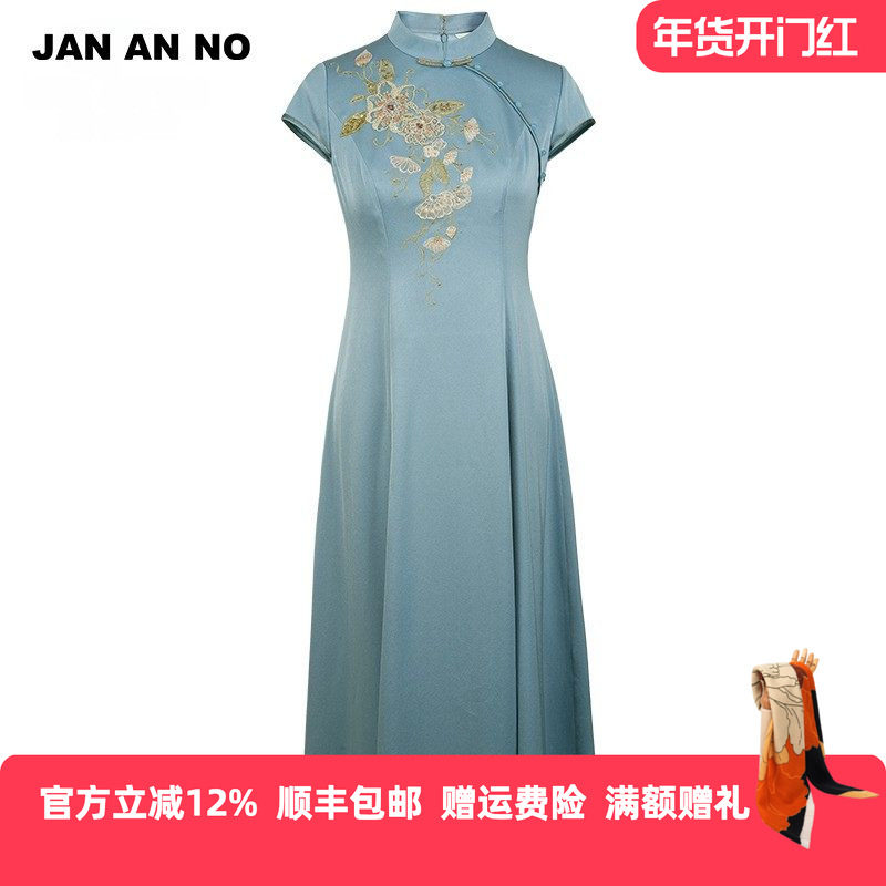 JAN AN NO 简爱诺典雅刺绣中国风礼服旗袍裙蓝色连衣裙J2110270LQ