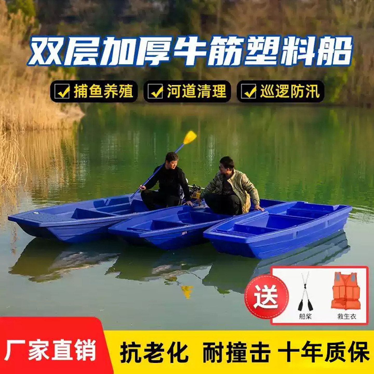 塑料船渔船双层加厚pe牛筋钓鱼捕鱼小船养殖河道清理保洁船冲锋舟