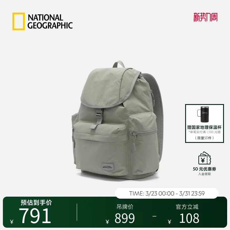 国家地理阿克隆户外运动休闲大容量双肩包书包抽拉绳设计收口背包