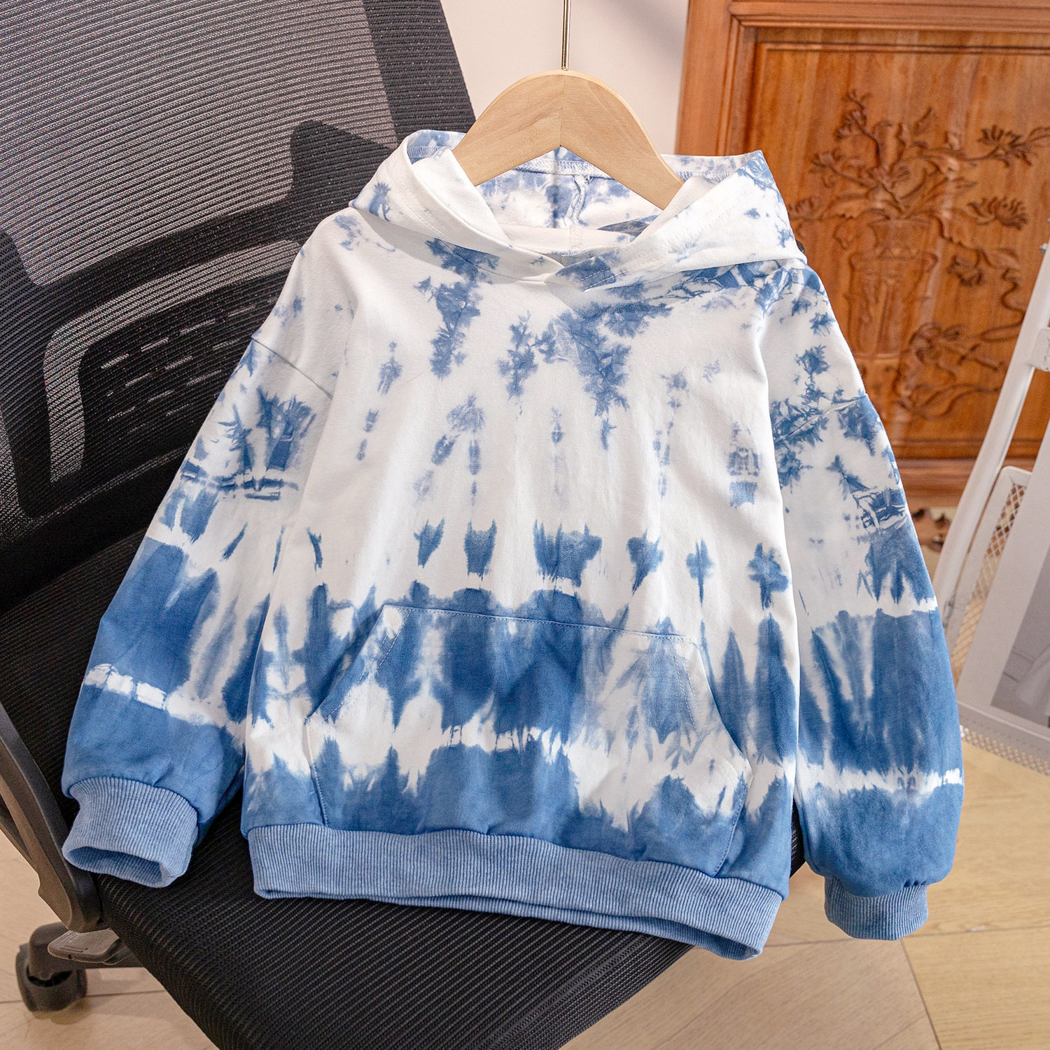 女童秋装长袖扎染连帽卫衣春秋装新款中大男童装纯色兜袋落肩上衣