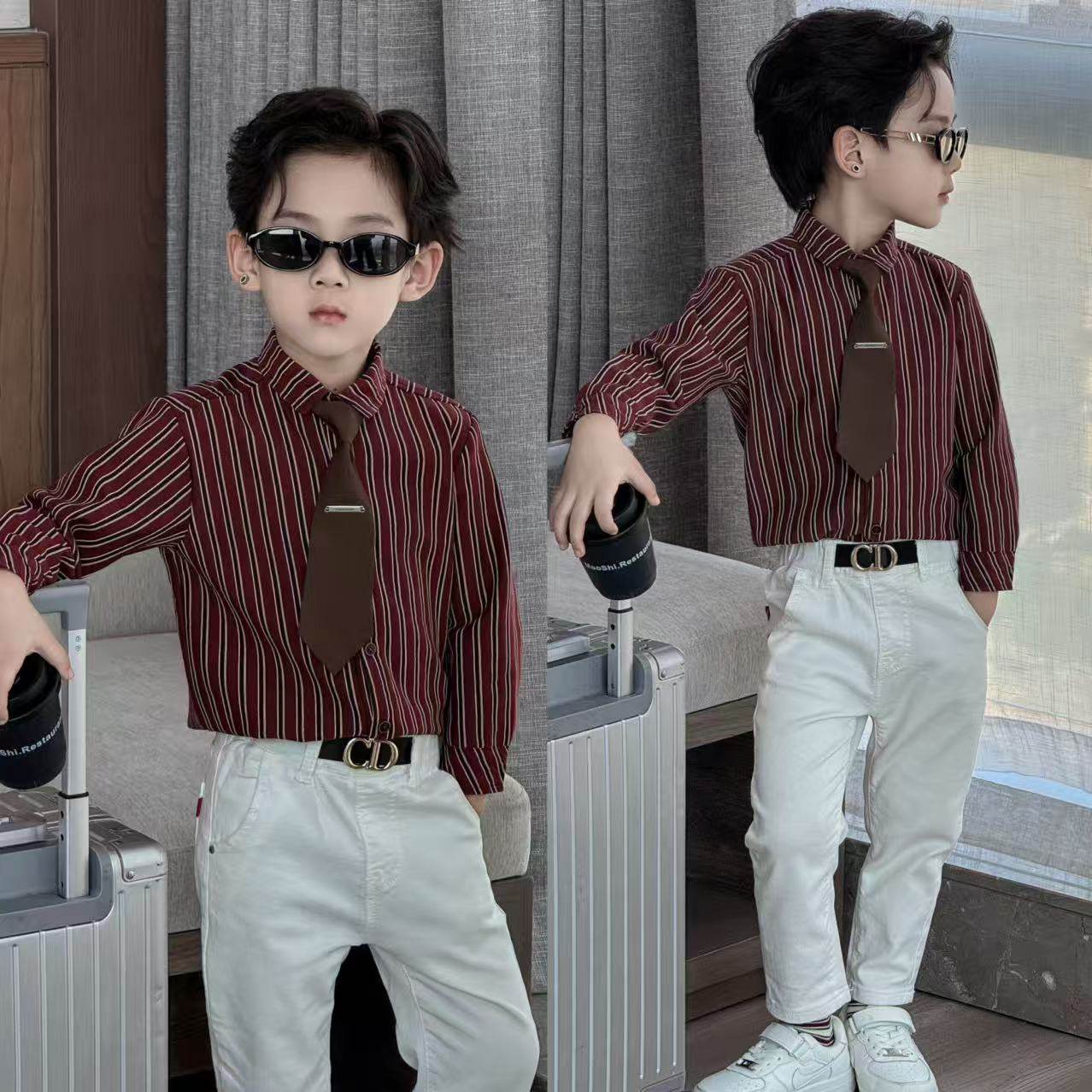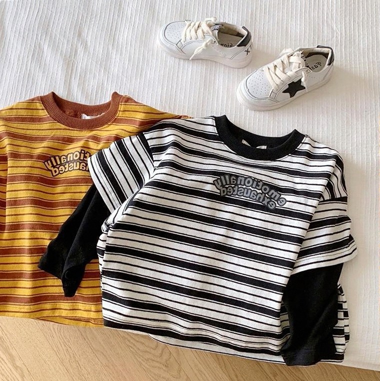 2024春秋款T日系宽松经典条纹假两件时尚圆领中大男童装体恤衫潮3