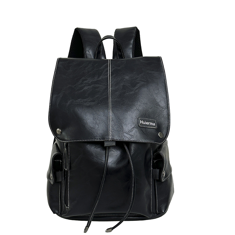 复古风黑色皮质双肩包男女通用大容量抽绳搭扣电脑包高中防雨书包