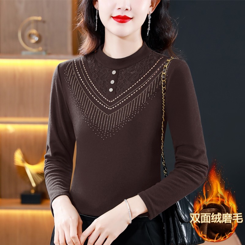 立领加绒打底衫女秋冬季洋气内搭中年妈妈可外穿秋衣加厚蕾丝上衣