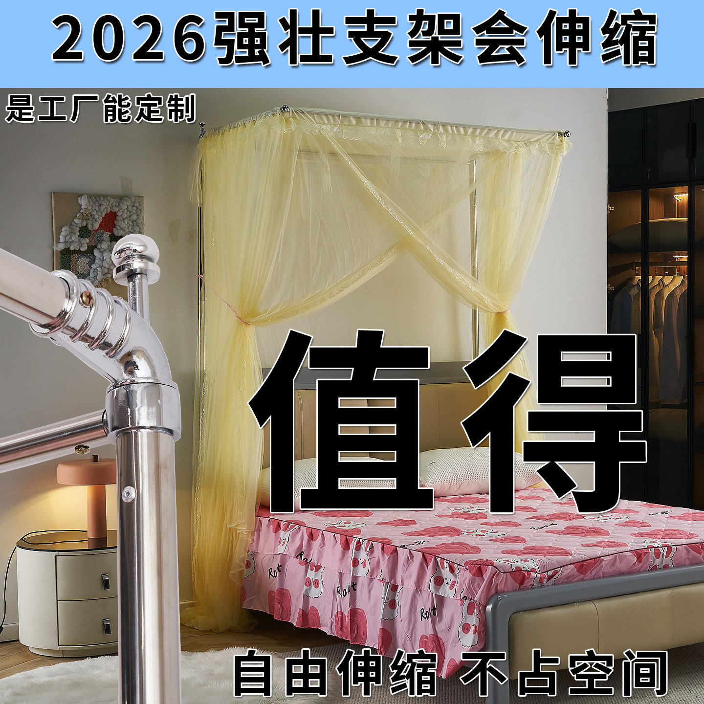 伸缩蚊帐不锈钢支架可升降钓鱼竿落地款加粗1.5米1.8米床家用2025