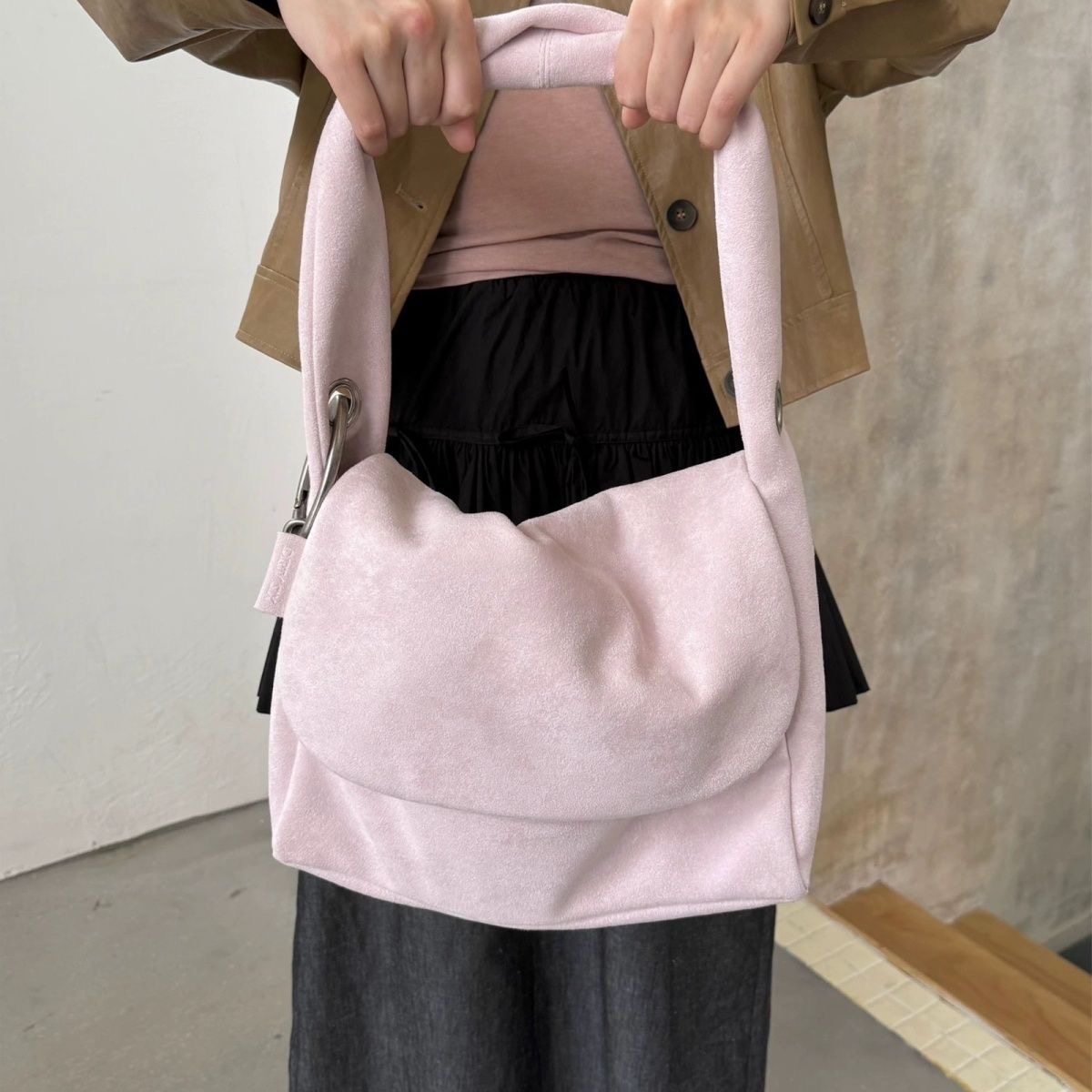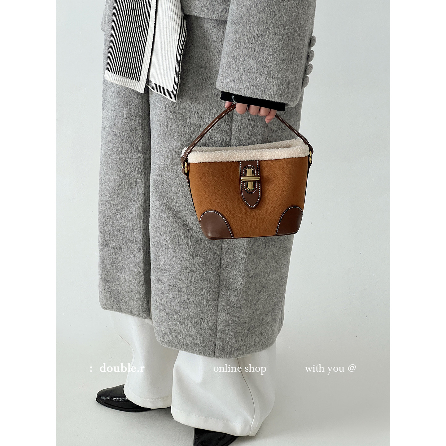 小脏柜 2024秋冬复古韩系小众撞色麂皮绒毛毛拼接单肩斜挎水桶包