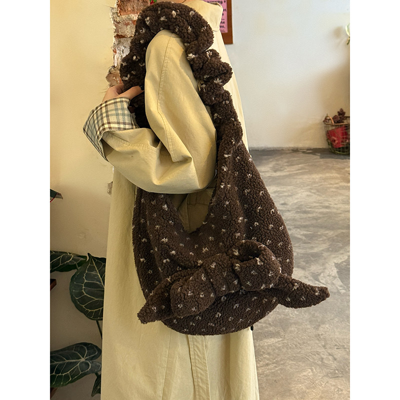 吾尤粒原创秋冬女新款25泰迪毛绒毛毛包棕色波点包可爱温暖手提包
