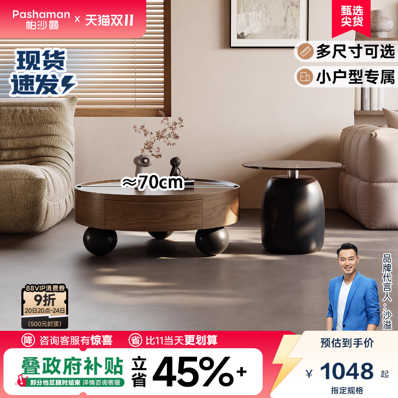 帕沙曼中古风奶油白实木茶几客厅家用轻奢大小圆桌组合沙发边几厅