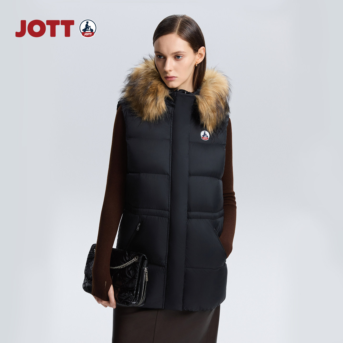 JOTT女士中长款羽绒马甲休闲百搭时尚保暖羽绒服女款连帽毛领马夹