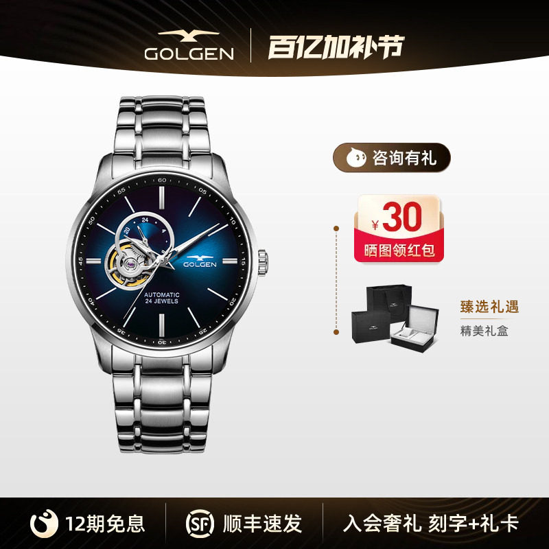 OBLVLO欧宝罗文艺复兴系列全自动机械表男士镂空强夜光钢带防水表