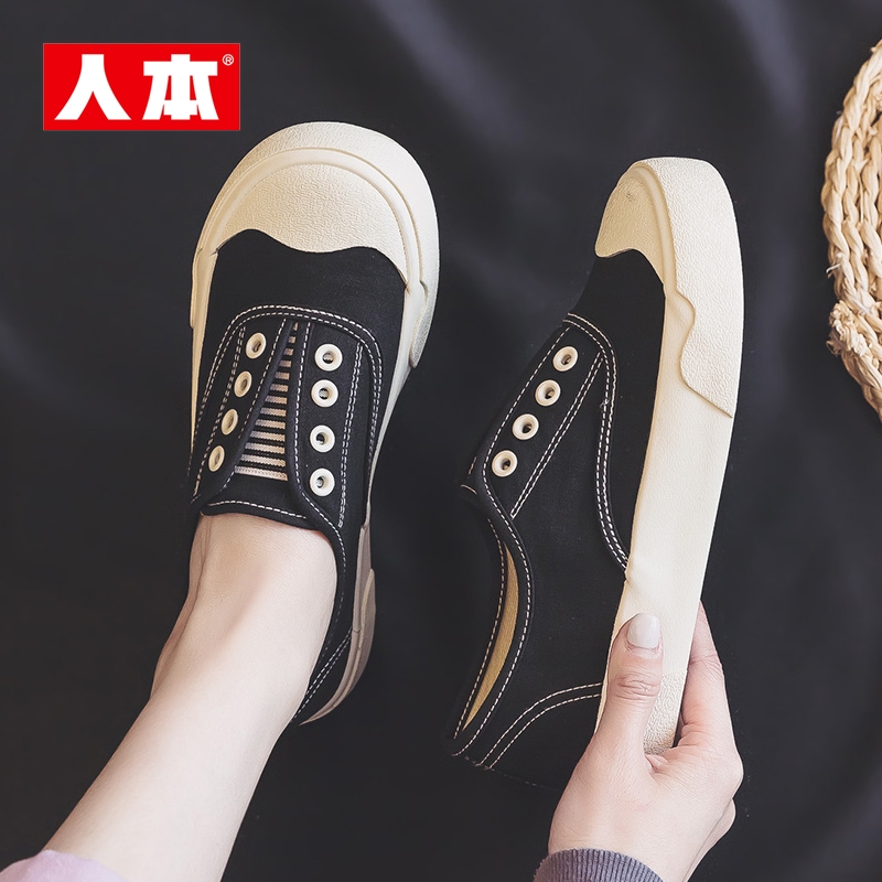 人本帆布鞋女2025春秋新款透气小白鞋女懒人鞋一脚蹬百搭平底鞋子