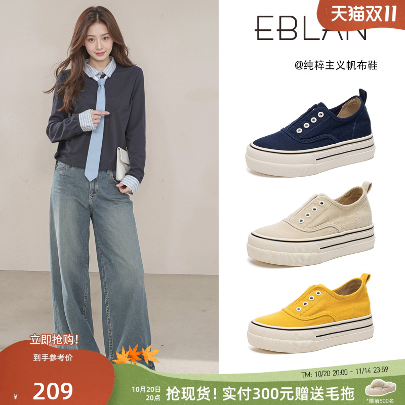 EBLAN/伊伴厚底内增高帆布鞋女2025秋季新款一脚蹬乐福鞋懒人板鞋