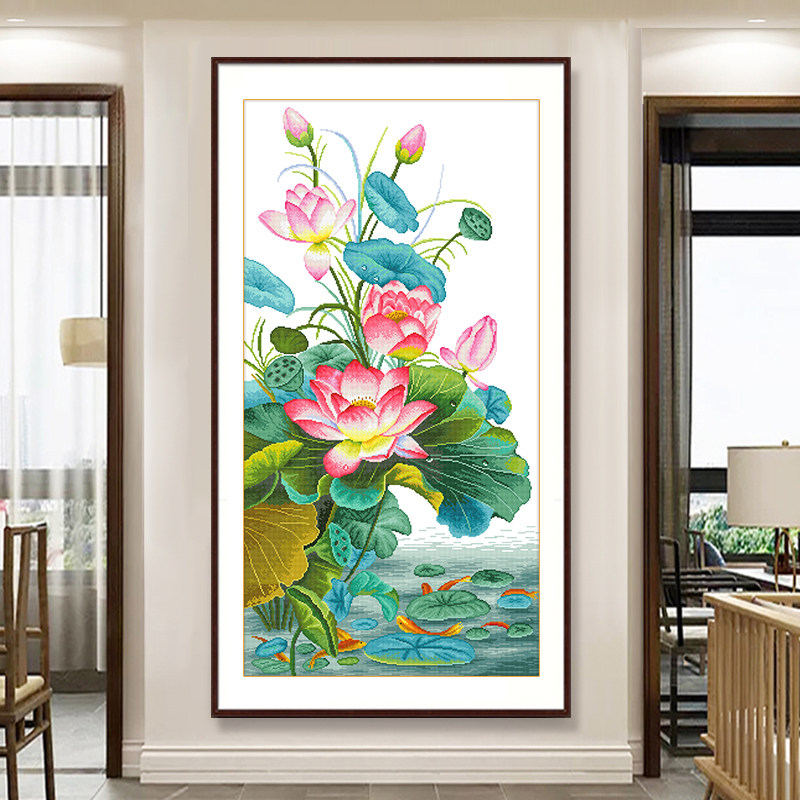 鱼悦清荷十字绣2025新款高级客厅简单大气简约竖版手工自己绣荷花