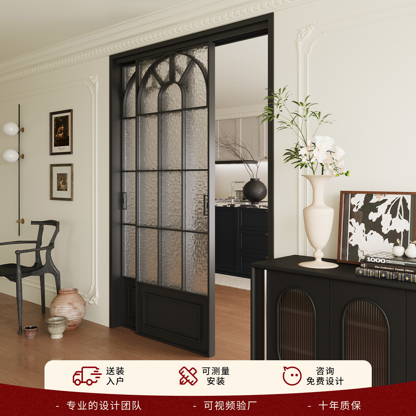 法式复古门中古风定制极窄三联动厨房推拉门阳台隔断吊轨玻璃移门