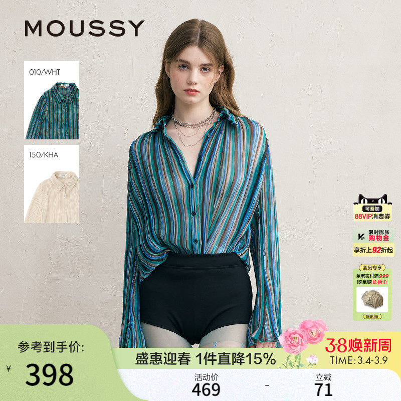 MOUSSY 秋季新品复古森系风条纹褶裥雪纺衬衫女010ISS30-8781