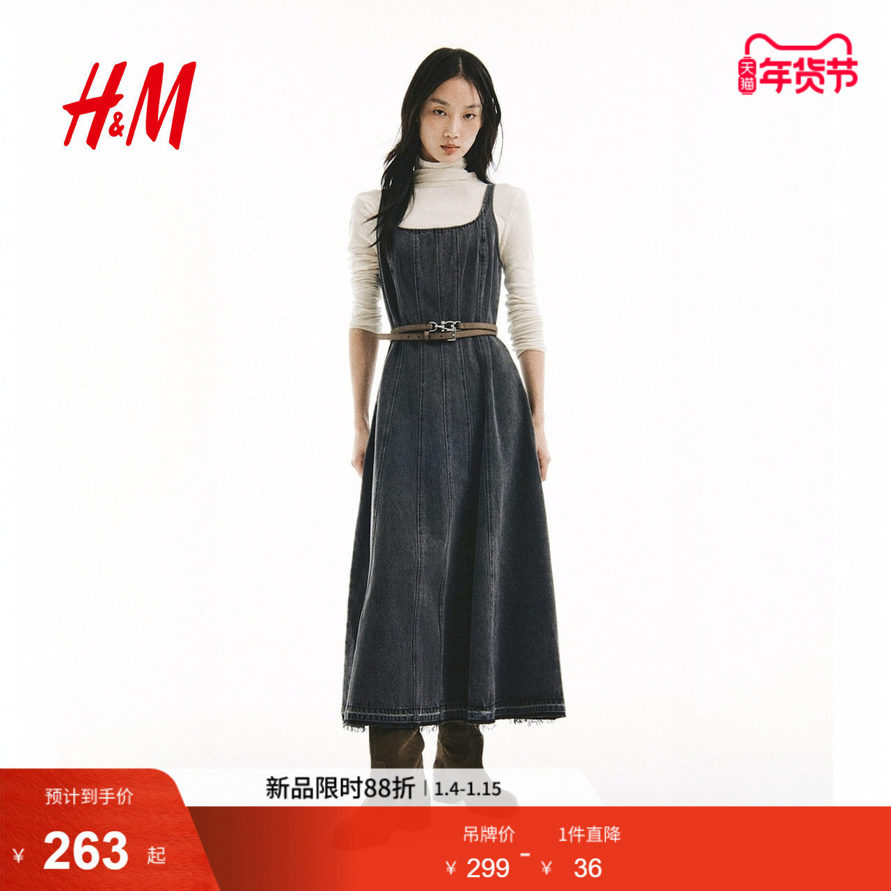 HM女装连衣裙冬季低领口V领喇叭形无袖牛仔连身裙1301383