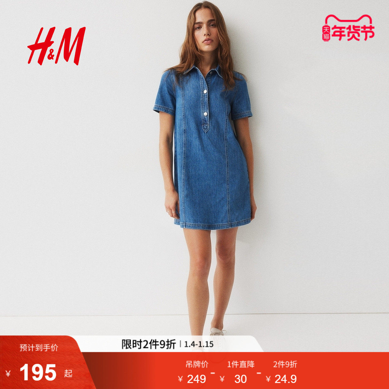 HM女装连衣裙冬季一字领时尚喇叭裙摆牛仔连衣裙1295542