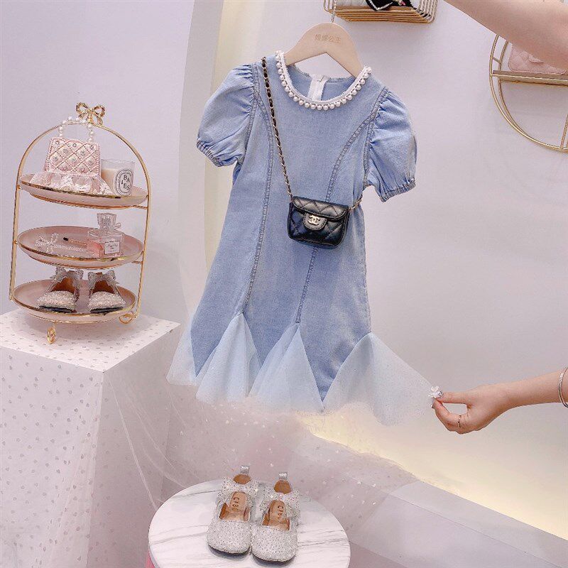 亲子装2024夏季新款母女装牛仔连衣裙女童时尚短袖钉珠网纱鱼尾裙