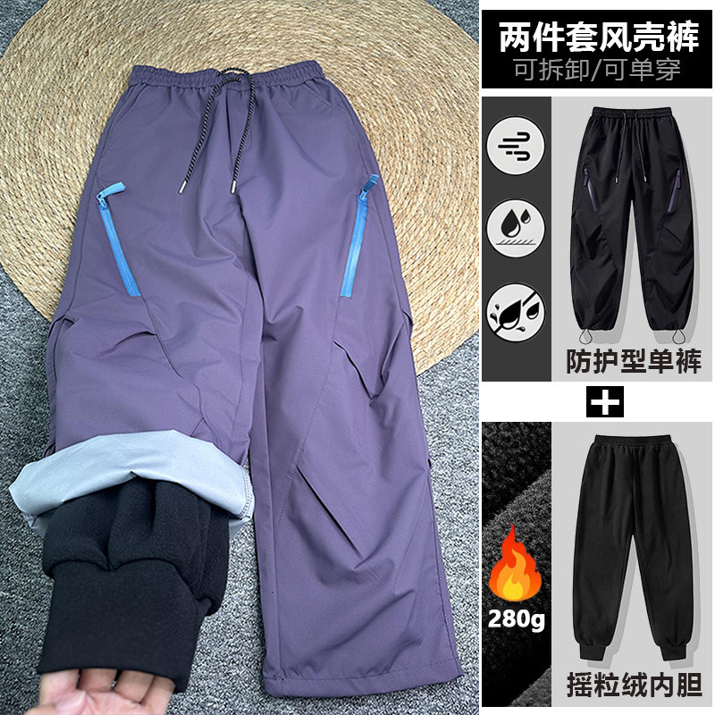 紫色美式软壳冲锋裤男冬季二件三合一抓绒内胆山系户外防寒滑雪裤