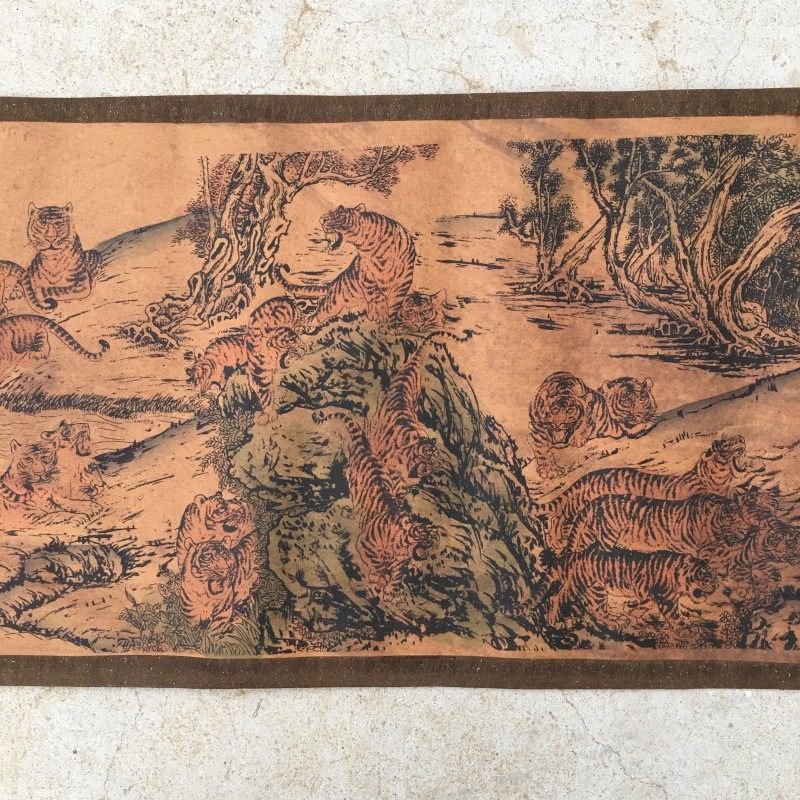 古董字画收藏百虎图长卷画家用复古装饰老字画仿古做旧古画老虎图